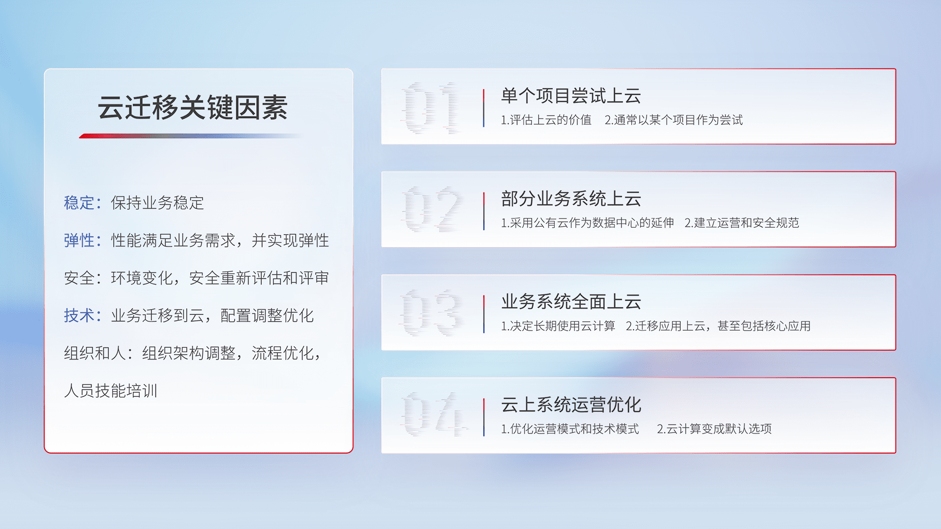 结合实际业务,,从规划设计、、、云平台选型、、云原生改造、、数据迁移、、、、集成交付,,,迁移全过程为客户识别最佳上云路径,,,做好风险识别管理,,,设计网络架构、、、身份权限、、安全审计合规、、、操作审计、、日志审计、、、监控告警策略、、、、多站点容灾设计等,,,,对云上基础设施进行整体规划,,,,提升IT治理水平,,,,以满足弹性、、、高可用、、、、高性能的需求。。。。