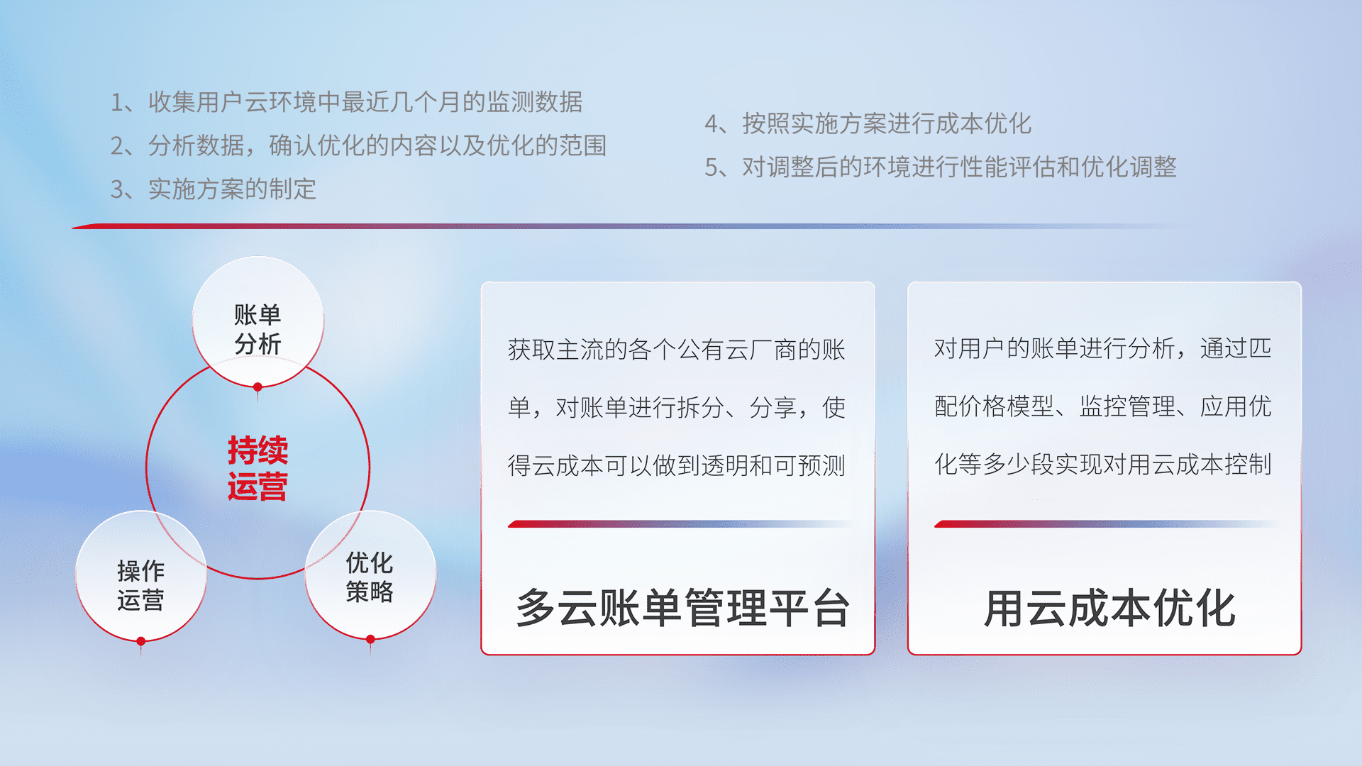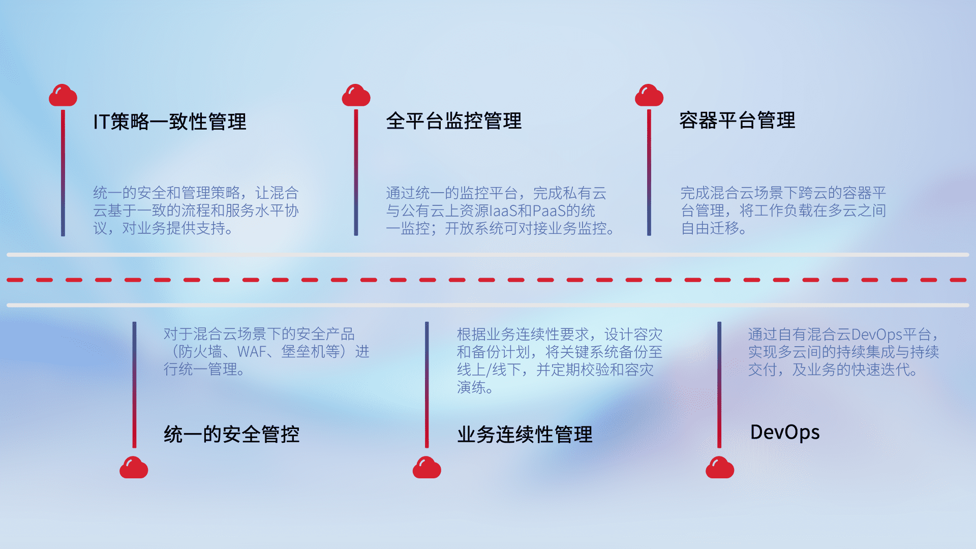 通过多云纳管,,,以统一的资源数据模型把客户的云资源进行抽象和封装,,,,进而实现对多云资源的统一操作,,保障云资源管理的可靠性、、、稳定性与可用性。。。量身定制化运维内容,,,,配置、、开发运维、、补丁管理、、、备份、、、、监控、、、认证和访问管理、、、审计和日常巡检等,,保障在用云过程中的可靠度,,,稳定度以及高可用率。。。。
