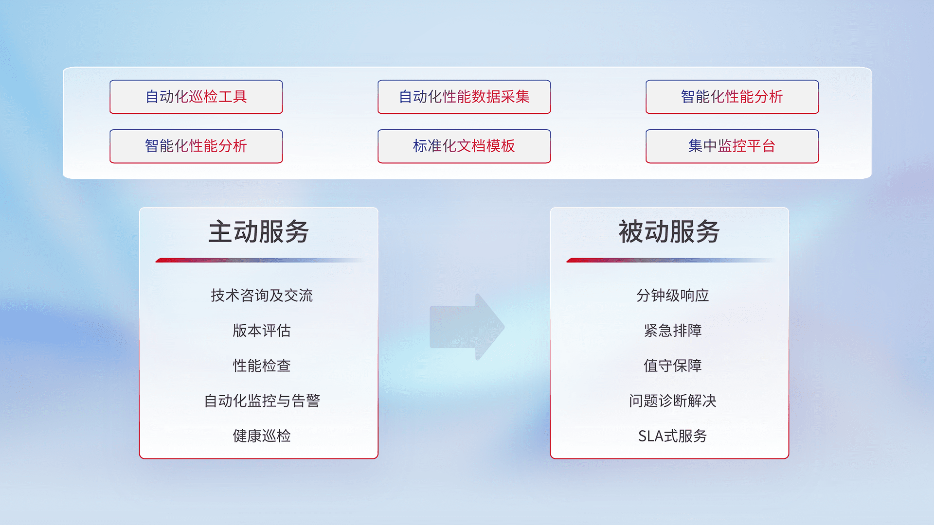 智能化工具和标准化文档,,,保障服务质量,,提供主动服务(包含技术咨询、、、、版本评估、、性能检查、、、、自动化监控与告警、、、、健康巡检)和被动服务包含(分钟级响应、、、、紧急排障、、、值守保障、、问题诊断解决、、、SLA服务)。。。